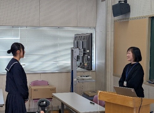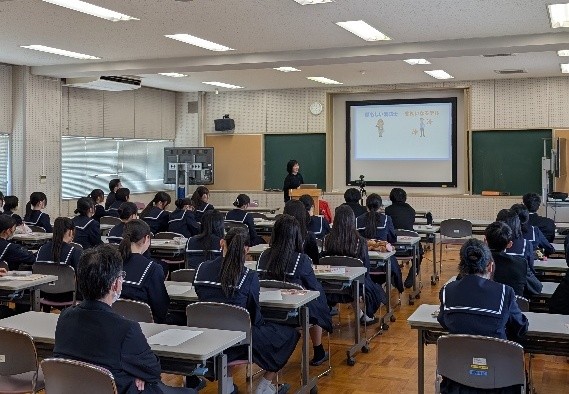 1年次の普通科の総合的な探究の時間では,これまでに探究活動をするための準備段階として,1学期に基礎スキルを身に着ける活動を,2学期以降は自分の進路に関する調査を通してクラス内でプレゼンテーションをする活動をしてきました。これらの活動をもとに,2年次から本格的な探究活動をしていくために,3学期に外部講師を招聘して特別授業を実施します。その第1弾として2月13日(金)にSDGs推進センターから毛利ちはる氏にお越しいただき,普通科の探究活動のメインテーマであるSDGsについて,その目的や現状,鯖江市の取り組みについてわかりやすく教えていただきました。