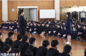最後に、在校生と新入生が初めて顔を合わせる対面式が行われました。生徒会長である笠島春佳さん(3年)から、新入生を温かく迎え入れる歓迎の言葉が送られると、新入生代表の飯田樺月さんは、「緊張と期待で胸がいっぱいですが、勉強や部活動に励み、伝統を受け継いでいきたい」と決意を述べました。1年生全員が、これから始まる高校生活に期待を膨らませた一日となりました。