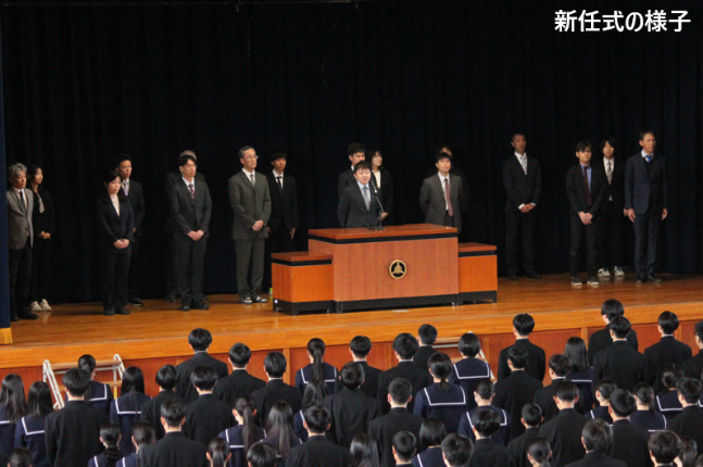 新任式では、松浦正樹教諭をはじめ、計18名の教職員を新たに迎えました。新任者を代表して松浦教諭より、「歴史ある本校に勤務できることを光栄に思い、身が引き締まる心地です。皆さんの明るい挨拶がとても印象的でした。全力で皆さんをサポートしていきます」との挨拶がありました。