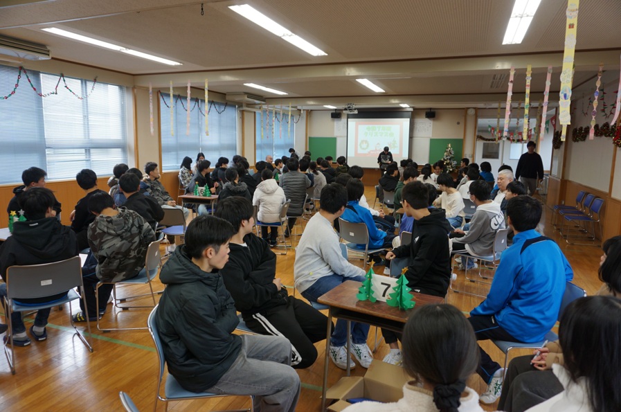 クラスの活動では、なんでもバスケット、絵しりとり、ハンカチ落としをしました。教室内で大人数、という条件でできるゲームがなかなか出てこなかったので来年のクリスマス会には、自分で調べて提案することができればもっと楽しい会にすることができるのかなと思います。生徒会企画では、ジャストワン、ピンポン玉リレー、ビンゴをしました。ピンポン玉リレーのルールがとても良かったと感じました。箸で運べたら2点、お玉で3点、スプーンで4点という、運ぶ難易度に合わせたちょうど良い点数調整になっていたからです。最初は箸が一番難しいと思っていましたが、実際やってみると箸はとても安定していて、走ってもピンポン玉が落ちることはありませんでした。とても楽しかったです。